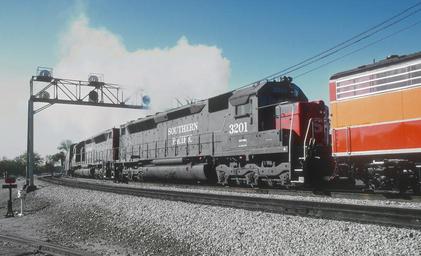 <b> A Roger Puta Photograph</b> southernpacific Southern Pacific Special - 19 Photos (30826315422).jpg en Roger Puta took this photo in San Jose CA <br> The Southern Pacific ran two passenger specials from San Jose to Sacramento and return on the weekend of April 27 and 28 1985 One on each day On Sunday 6051 remained in Sacramento to become an artifact at the California State Railroad Museum I'm pretty sure Roger shot the Saturday morning train to Sacramento He put no captions on these slides Some of the locations have been positively identified by landmarks A few are a little soft <br> The power was E9A 6051 and commuter SDP45s 3201 and 3207 <br> <b> A Roger Puta Photograph</b> 2016-11-12 13 38 54 https //www flickr com/people/129679309 N05 railfan 44 https //www flickr com/photos/129679309 N05/30826315422/ User Fæ/Flickr API Puta's Southern Pacific Employee's Special April 1985 Puta's UP and pre-Union Pacific Photos train railroad railfans fallen flags United States Locomotive Photographers Western Railroads American Rails North American Railroads U S Railfan Pictures All Locomotives Railroad Picture Hall of Fame Classic EMD Power EMD Gallery California Railfans Western US Railroad Photography Railroad Sightings Railroad Photography Junction Southern Pacific Cc-zero RogerPuta Photographs by Roger Puta Photos uploaded from Flickr by Fæ using a script 1985 in rail transport in the United States |
