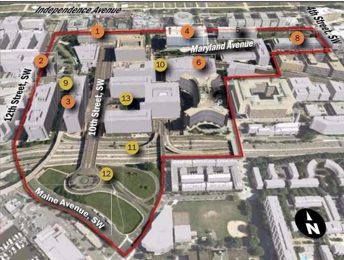 Keywords: Southwest Ecodistrict - National Capital Planning Commission - 2009.jpg en Map of the boundaries of the Southwest Ecodistrict an initiative of the U S National Capital Planning Commission which seeks to redevelop L'Enfant Plaza and its environs into a multi-modal mixed-use neighborhood of significant cultural attractions and public spaces offices residences and amenities Numbered circles on the map correspond to the following <br> 1 - U S Department of Energy/James V Forrestal Complex<br> 2 - Cotton Annex<br> 3 - U S Postal Service headquarters<br> 4 - Federal Aviation Administration headquarters<br> 5 - Federal Aviation Administration headquarters<br> 6 - General Services Administration<br> 7 - U S Department of Housing and Urban Development Robert C Weaver Federal Building <br> 8 - U S Department of Education<br> 9 - 12th Street Tunnel<br> 10 - CSX Rail Line/Maryland Avenue SW<br> 11 - Southwest Freeway Interstate 395 <br> 12 - 10th Street Overlook/Benjamin Banneker Park<br> 13 - L'Enfant Plaza http //www ncpc gov/DocumentDepot/Planning/SWEcodistrictInfoSheet pdf U S National Capital Planning Commission 2009 PD-USGov L'Enfant Plaza National Capital Planning Commission |