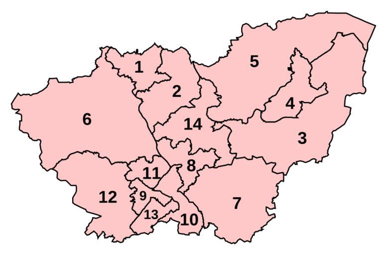 Keywords: SouthYorkshireParliamentaryConstituencies2007.svg Numbered map of the new Parliamentary constituencies of South Yorkshire 2009-12-12 own assumed Wereon Locator maps of parliamentary constituencies of South Yorkshire