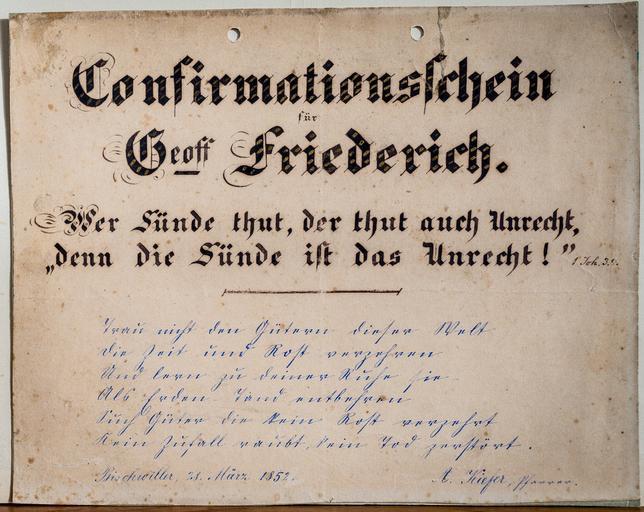 | Keywords: Souvenir de confirmation Bischwiller 1852.jpg Souvenir de confirmation Bischwiller 1852 Collection Gustave Koch own 2014-02-27 10 00 19 Photo Claude TRUONG-NGOC User Ctruongngoc/Bandeau crédit photo Supported by Wikimedia France PD-old-70 Souvenirs de confirmation protestants alsaciens Bischwiller |