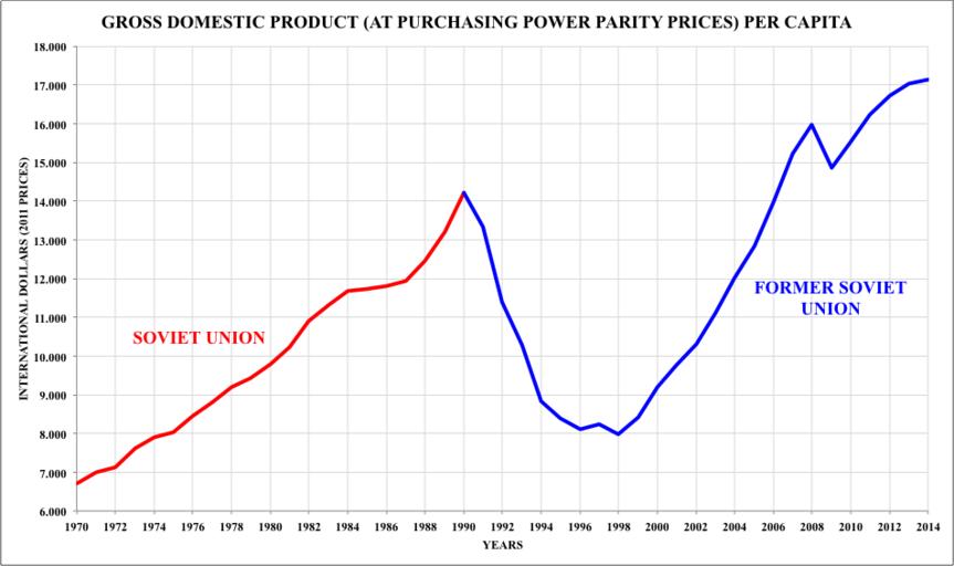 Keywords: Soviet Union GDP per capita.gif en A chart showing GDP per capita for the Soviet Union USSR and the Post-Soviet states FSU for the years 1970-2010 Based on the data of the UN http //unstats un org/unsd/snaama/selbasicFast asp Statistics Division Emilfaro <gallery> File Soviet Union Population gif Population File Soviet Union GDP gif GDP </gallery> The data wikitable style text-align right USSR/FSU GDP per capita - 1970 6 714 - 1971 6 998 - 1972 7 128 - 1973 7 607 - 1974 7 899 - 1975 8 034 - 1976 8 457 - 1977 8 818 - 1978 9 191 - 1979 9 419 - 1980 9 796 - 1981 10 225 - 1982 10 910 - 1983 11 316 - 1984 11 669 - 1985 11 726 - 1986 11 798 - 1987 11 934 - 1988 12 449 - 1989 13 198 - 1990 14 225 - 1991 13 326 - 1992 11 399 - 1993 10 276 - 1994 8 845 - 1995 8 383 - 1996 8 108 - 1997 8 247 - 1998 7 980 - 1999 8 412 - 2000 9 199 - 2001 9 774 - 2002 10 308 - 2003 11 120 - 2004 12 014 - 2005 12 848 - 2006 13 984 - 2007 15 234 - 2008 15 984 - 2009 14 860 - 2010 15 532 - 2011 16 220 - 2012 16 722 - 2013 17 026 - 2014 17 130 Economy of the Soviet Union Collapse of the Soviet Union |
