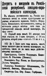| Keywords: Sovnarkom-Gregorian-Calendar-Decree-izo39.jpg Partial Russian text of the decree adopting the Gregorian calendar in Russia as published in Pravda nowrap 25 January 1918 Julian or 7 February 1918 Gregorian The full text of the article Decree regarding the introduction of the Western European calendar in the Russian Republic In order to establish in Russia the same way of counting time as used by almost all civilized people the Council of the People's Commissars decrees the introduction of the new calendar into lay i e non-religious use after the end of the month of January of this year Accordingly 1 The first day after 31 January of this year is to be counted not as the 1st of February but as the 14th of February the second day counted as the 15th and so on 10 Until 1 July of this year one should write after each date in the new calendar the parenthesized date according to the calendar that has been in effect until now President of the Council of the People's Commissars V Ulyanov Lenin Assistant People's Commissar for Foreign Affairs Chicherin People's Commissars Shlyapnikov Petrovsky Amosov Obolensky Secretary of the Council of the People's Commissars Gorbunov Items 2 9 that were omitted from the Pravda article specify how salaries and dates of obligations that were to occur during 1 13 February Julian should be adjusted http //web archive org/web/20080303123445/http //www niv ru/library/006/001 htm ДЕКРЕТ О ВВЕДЕ ИИ ЗАПАД О-ЕВРОПЕЙСКОГО КАЛЕ ДАРЯ Decree On the introduction of the Western European calendar contains the complete Russian text of the decree Since the document was published before the Reforms of Russian orthography were finalized in late 1918 the old Russian spelling is still used ru «Дек ет о введении в Российской еспублике западноев опейского календа я» п инятый Совна комом 24 янва я 1918 г Этот дек ет подписан В И Лениным и опубликован 25 янва я 1918 г http //grigam narod ru/kalend/kalen19 htm Исто ия календа я в России и в СССР Calendar history in Russia and the USSR V Ulyanov Lenin and his People's Commissars 1918-01-25 PD-old 1918 in Russia Calendars of the Soviet Union Council of People's Commissars Gregorian calendars |