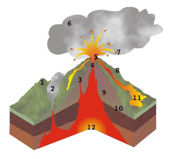 | Keywords: Spaccato vulcano i18.png Volcan cross section 1-Inactive volcan; 2-Fumarole; 3-Secondary volcanic pipe; 4-Volcanic pipe; 5-Crater; 6-Ash cloud; 7-Volcanic bomb; 8-Volcan cone; 9-Ash bed; 10-Solid lava flow; 11-Lava flow; 12-Magmatic chamber http //commons wikimedia org/wiki/Image Spaccato_vulcano png Luigi Chiesa modified bY Zimbres 19 39 22 May 2006 UTC Free for all use Volcanological diagrams Block diagrams cartography Diagrams labelled with numbers only Diagrams of volcanoes | ||||