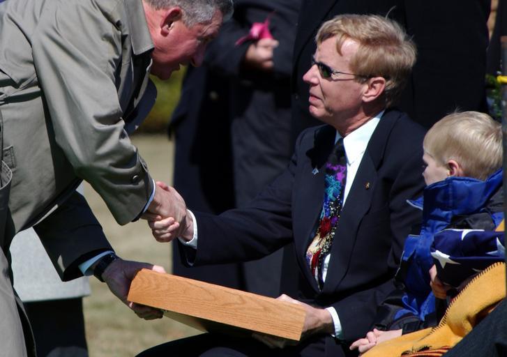 | Keywords: Space Shuttle Columbia funeral -d.jpg en 030310-N-6967M-004 Arlington Va Mar 10 2003 -- Jonathan Clark husband of NASA Astronaut and Navy Captain Laurel Blair Salton Clark receives a flag that was flown at half-mast over the Lyndon B Johnson Space Center in Houston Texas The crew of the Space Shuttle Columbia are being laid to rest near the memorial that honors the Astronauts from the space shuttle Challenger in Arlington National Cemetery U S Navy photo by Photographer's Mate 1st Class Shane T McCoy RELEASED https //www news navy mil/view_photos asp page 459 sort_type 0 sort_row 1 Shane T McCoy 2003-03 PD-USGov-Military-Navy Space Shuttle Columbia disaster Photographs by Shane T McCoy Funerals of military people in the United States |