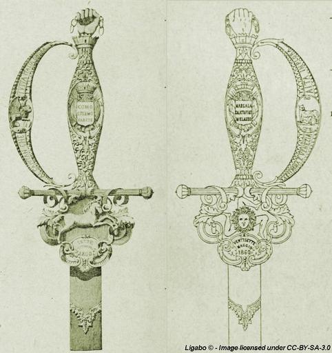 Keywords: SpadaBeppe1860.jpg watermark sciabola d'onore offerta a Giuseppe Garibaldi dal Comitato Italiano in riconoscenza alla sua opera per l'Unità d'Italia presentati al Generale l'8 ottobre 1860 in Santa Maria Capua Vetere <br/>Il pomolo è costituito da una mano destra che fuoriesce da una corona turrita spezzando una catena e poggia sull'impugnatura finemente istoriata che reca centralmente sui due lati i nomi delle più importanti imprese garibaldine del 1859 COMO - S FERMO - VARESE e del 1860 MARSALA - CALATAFIMI - MILAZZO La guardia sembra sorreggere ad insegna i due lati del ricasso impreziositi dalle figure della triscele di Sicilia e della Marsala la cavalla prediletta di Garibaldi oltre alle date 27 MAGGIO 1860 e 7 SETTEMBRE 1860 inizio dei combattimenti a Palermo ed entrata di Garibaldi a Napoli Il paramano reca nel centro il leone di san Marco e la lupa capitolina simboli delle città di Roma e Venezia accompagnati dalle scritte AL CAPITAN CHE TUTTA ITALIA ONORA - CUI ROMA E VENEZIA AITA IMPLORA Immagini assemblate e modificate Alfredo Comandini L'italia nei cento anni del secolo XIX Tomo III 1850-1860 Antonio Vallardi Editore Milano 1907-1918 Sconosciuto - Ligabo 1860 PD-old Giuseppe Garibaldi Triskelion Sicily |