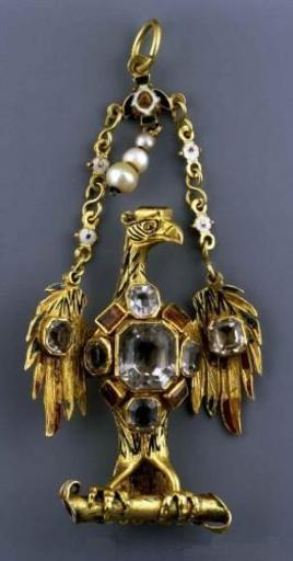 Keywords: Spain Eagle pendant.jpg Spain mid other date century 16 stones gold Institution National Museum Warsaw 2 accession number SZM 1922 object history credit line own See below DEFAULTSORT 1550 circa; Eagle pendant Memorabilia of Sigismund Augustus Jewellery in the National Museum in Warsaw Spanish art in the National Museum in Warsaw Animal-shaped pendants 16th-century jewellery Jewellery of Poland Eagles in jewellery |