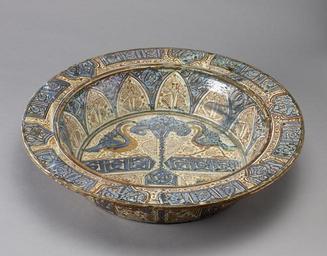 Keywords: Spanish - Basin - Walters 481013 - Three Quarter.jpg The art of making ceramic objects with luster decoration which has a metallic sheen probably began in 9th-century Iraq and spread throughout the Islamic world including to al-Andalus the Arabic name for Spain There large quantities of high quality lusterware were produced during the 14th and 15th centuries and influenced ceramic decoration well after the last Islamic dynasty in Spain came to an end in 1492 Often called Hispano-Moresque ware such pieces regularly feature foliage designs and inscriptions in pseudo-Arabic script as on this basin The basin's combination of luster designs with those painted in blue including two birds flanking a stylized tree is also typical of this ceramic tradition early-mid 15th century late Medieval earthenware with underglaze and luster decoration cm 11 49 6 accession number 48 1013 34987 Dikran Kelekian Paris and New York Henry Walters city Baltimore Walters Art Museum Henry Walters Acquired by Henry Walters 1925 place of origin Manises Spain Walters Art Museum license Medieval art in the Walters Art Museum Islamic art in the Walters Art Museum Spanish maiolica Media contributed by the Walters Art Museum needs category review |
