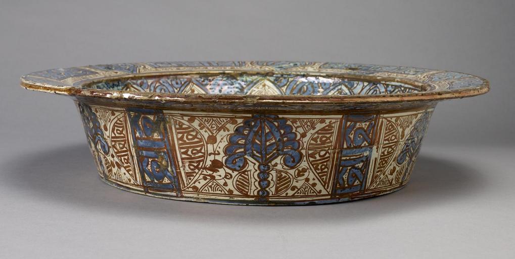 Keywords: Spanish - Basin - Walters 481013 - Side A.jpg The art of making ceramic objects with luster decoration which has a metallic sheen probably began in 9th-century Iraq and spread throughout the Islamic world including to al-Andalus the Arabic name for Spain There large quantities of high quality lusterware were produced during the 14th and 15th centuries and influenced ceramic decoration well after the last Islamic dynasty in Spain came to an end in 1492 Often called Hispano-Moresque ware such pieces regularly feature foliage designs and inscriptions in pseudo-Arabic script as on this basin The basin's combination of luster designs with those painted in blue including two birds flanking a stylized tree is also typical of this ceramic tradition early-mid 15th century late Medieval earthenware with underglaze and luster decoration cm 11 49 6 accession number 48 1013 34987 Dikran Kelekian Paris and New York Henry Walters city Baltimore Walters Art Museum Henry Walters Acquired by Henry Walters 1925 place of origin Manises Spain Walters Art Museum license Medieval art in the Walters Art Museum Islamic art in the Walters Art Museum Spanish maiolica Media contributed by the Walters Art Museum needs category review |