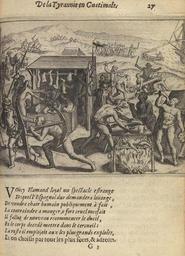 Keywords: Spanish selling and forcing to eat human flesh full fol 27.JPG en Spanish conquistadors selling and forcing to eat human flesh to the native americans in the 16th century Of the Tyranny of the spanish in Guatemala in the book Le miroir de la cruelle horrible tyrannie espagnole perpetrée au Pays Bas par le tyran duc de Albe autres commandeurs de par le roi Philippe le deuxième 1620 Holland Title Espejo de la cruel y horrible tiranía española perpetrada en los Países Bajos por el tirano el duque de Alba y otros comandantes del rey Felipe II published in the Netherlands in 1620 http //www wdl org/es/item/515/view/1/244/ Johannes Gysius 1620 other versions Text under the image translated to english from french See here loyal Flemish refering the Flemish people a weird spectacle from which the spaniards hardly will ask for appreciation To sell human flesh to the public forcing them to eat it or they will suffer a cruel misdoing The mourning has to be started again and the dead bodies to be put in a coffin The rest of the natives were used for the greatest deeds expeditions and above all the strongest and cleverest are chosen PD-old-100-1923 Johannes Gysius Aztec Azteca Human cannibalism in art Conquest of the Americas Conquistadors Conquista Guatemala in the 16th century Mexico Genocide Uploaded with UploadWizard |