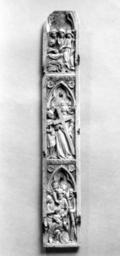 Keywords: Spanish - Wing of a Folding Tabernacle with Scenes of the Passion - Walters 71176.jpg This plaque along with Walters 71 175 are the only surviving ivories from a folding tabernacle that contained a Crucifixion They are of unusually tall form and combine features of the Rose Group in the bands of roses that divide the scenes horizontally with trefoil arches flanked by rosettes The placement of this wing in the shrine was second from the left This wing is carved from bottom to top with the Arrest of Christ Carrying of the Cross and Three Marys at the Tomb The wing is hinged on both sides with diagonally set iron hinges While a couple of iconographical rarieties exist in the scenes on Walters 71 175 the scenes on this wing are typical of Rose Group ivories A Parisian work may have served as the model The carving here is very uneven in quality The enframements are unusual and the form of a tabernacle for a central Crucifixion group is unique These features combined with the use of iron hinges suggest a non-French center The frequent use in Spain of tabernacle enclosures for sculpture would seem to confirm a Spanish attribution Both plaques have suffered from exposure They have been cut horizontally at the top and the remaining hinges have rusted and broken the ivory There are iron nails centrally placed in the trefoil arches of three scenes Each plaque is inscribed on the back 8809/R-73101/las dos tiras between 1300 1330 Medieval ivory cm 28 7 4 6 accession number 71 176 25537 Spain Léon Gruel Paris date of acquisition unknown by purchase in Spain Henry Walters city Baltimore Walters Art Museum Henry Walters Acquired by Henry Walters 1923 Transcription On back 8809/R-73101/las dos tiras place of origin Spain Walters Art Museum license Medieval ivory in the Walters Art Museum Art of Spain Media contributed by the Walters Art Museum needs category review |