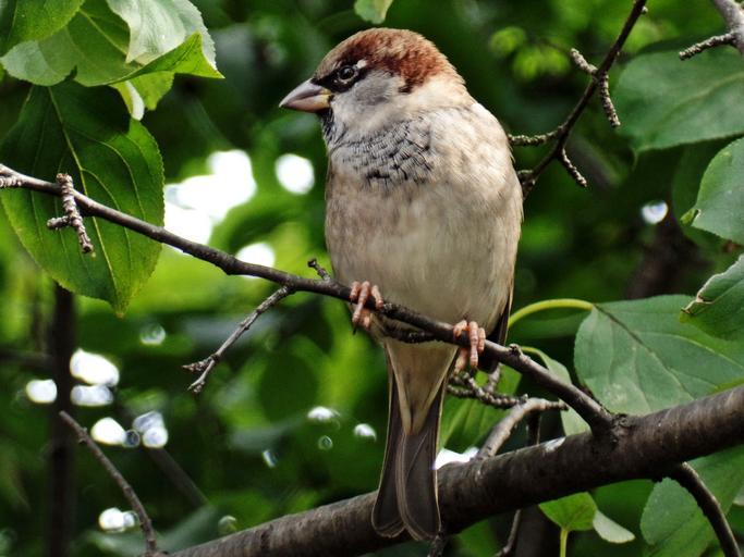 Keywords: sparrow bird close feather plumage tree leaves nature spring dress animal