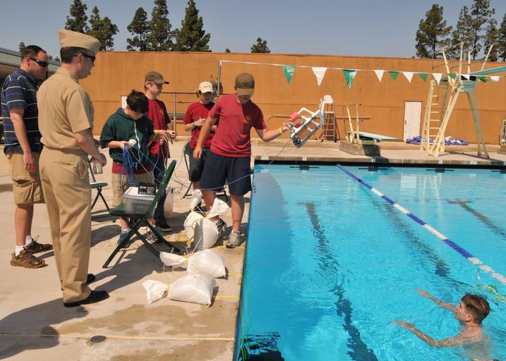 Keywords: SPAWAR supports SeaPerch San Diego STEM event 130427-N-UN340-012.jpg en Capt D J LeGoff Tactical Network Program Manager PMW 160 observes a team of Boy Scouts remove their team's SeaPerch Remotely Operated Vehicle ROV from the pool following the deepwater mission portion of the San Diego Regional SeaPerch Competition at Grossmont College SeaPerch sponsored by the Office of Naval Research ONR is an innovative underwater robotics program that trains teachers to teach their late elementary through high school students how to build ROVs from low-cost kits LeGoff and several Space and Naval Warfare Systems Command SPAWAR personnel volunteered as judges timekeepers and in-water assistants at the event As the Navy's Information Dominance Systems Command SPAWAR supports robotics development and strongly encourages all students to explore careers in science technology engineering and mathematics STEM fields U S Navy photo by Rick Naystatt /Released 2013-04-27 Rick Naystatt https //www dvidshub net/image/919383 130427-N-UN340-012 2013-05-01 12 18 SAN DIEGO CA US PD-USGov-Military-Navy Space and Naval Warfare Systems Command Office of Naval Research Images from DoD uploaded by Fæ |