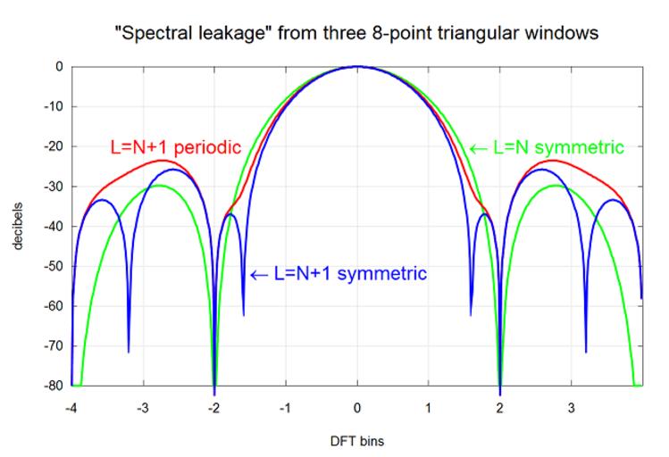 | Keywords: Spectral leakage from three 8-point triangular windows.png en Comparing the discrete-time Fourier transforms of symmetric and periodic windows The triangular form was chosen for its non-zero end-points one of which is discarded in the periodic version with a noticeable performance degradation Parameter L is the width of the base of the triangle in units of the sample interval Parameter N is 8 2016-04-11 own Bob K other versions Octave script <source lang Matlab > pkg load signal graphics_toolkit gnuplot clc M 7200; window triang M '; row vector N 8; window size in samples dx M/ N+1 ; decimation factor for 9 hops 10 samples symmetric9 window 1+ 1 8 dx ; sample symmetrically periodic9 window 1+ 5 7 5 dx ; sample asymmetrically dx M/N; decimation factor for 8 hops 9 samples symmetric8 window 1+ 5 7 5 dx ; sample symmetrically Compare equivalent noise bandwidths info only ENBW_symmetric9 N sum symmetric9 2 /sum symmetric9 2 ENBW_symmetric8 N sum symmetric8 2 /sum symmetric8 2 ENBW_periodic9 N sum periodic9 2 /sum periodic9 2 Plot the points figure plot 0 7 symmetric9 'color' 'blue' ' ' hold on plot 0 7 symmetric8 'color' 'green' ' ' plot 0 7 periodic9 'color' 'red' ' ' Now compute and plot the DTFTs M 64 N; dr 80; H abs fft symmetric8 zeros 1 M-N ; H fftshift H ; H H/max H ; H 20 log10 H ; H max -dr H ; x N -M/2 M/2-1/M; figure plot x H 'color' 'green' 'linewidth' 2 hold on ylim -dr 0 H abs fft periodic9 zeros 1 M-N ; H fftshift H ; H H/max H ; H 20 log10 H ; H max -dr H ; plot x H 'color' 'red' 'linewidth' 2 ; H abs fft symmetric9 zeros 1 M-N ; H fftshift H ; H H/max H ; H 20 log10 H ; H max -dr H ; plot x H 'color' 'blue' 'linewidth' 2 ; set gca 'XTick' -N/2 N/2-1 grid on ylabel 'decibels' xlabel 'DFT bins' text -1 51 -52 '\leftarrow L N+1 symmetric' 'color' 'blue' 'FontSize' 14 text 1 56 -20 3 '\leftarrow L N symmetric' 'color' 'green' 'FontSize' 14 text -3 46 -20 3 'L N+1 periodic' 'color' 'red' 'FontSize' 14 title ' Spectral leakage from three 8-point triangular windows' 'FontSize' 14 </source> cc-zero Digital signal processing |