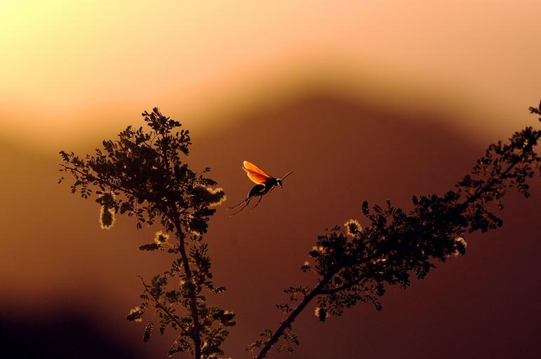 Keywords: spider wasp tarantula hawk insect outdoors flying plant wildlife nature bug flower evening sunset silhouettes