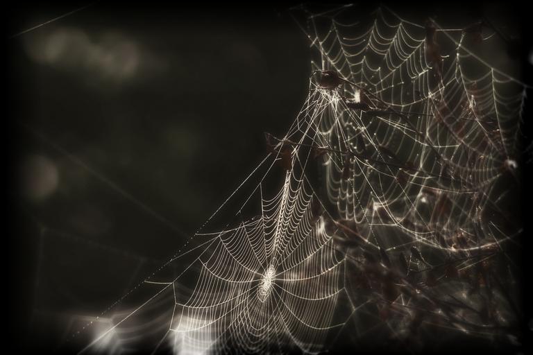 Keywords: spider web cobweb insect creepy black and white macro nature outside arachnophobia close-up fright vignette