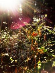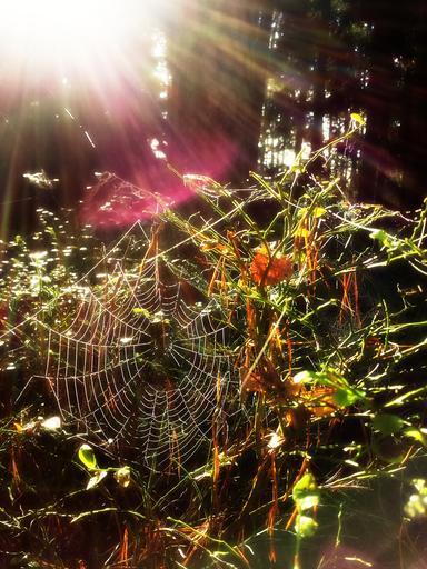 Keywords: spider web nature forest morning sunny sunlight sunrays beams shine bright autumn outdoor woods vegetation countryside flora plants backlit natural