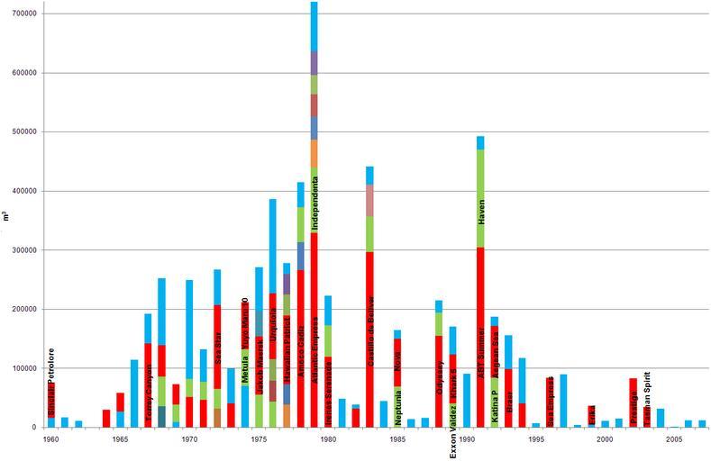 Keywords: Spill Volume.PNG en Oil spills by tankers; In red the largest spill that year by one tanker In lightblue all spills smaller then 30000 m3 combined Other colours single spills larger then 30000 m3 own based on http //www c4tx org/ctx/job/cdb/prod/search html CTX Casualty Database BoH 2008-09-06 Based on spills of more then 1000 m3 in the http //www c4tx org/ctx/job/cdb/prod/search html CTX Casualty Database Oil tankers |