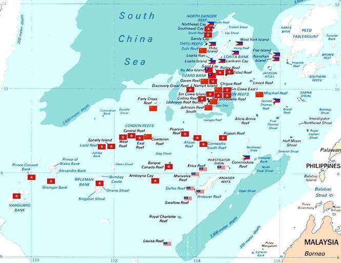 | Keywords: Spratly with flags.jpg locator map BadJPEG Spratly islands map showing occupied features marked with the flags of countries occupying them <br> Philippines Philippines <br> the Republic of China Republic of China Taiwan <br> Vietnam Vietnam <br> Malaysia Malaysia <br> China People's Republic of China <br> The flags are placed such that no text and other flag is overlapped Hence some flags are not in the exact coordinates where they should actually lie However they still portray the general picture on how Spratly Islands are divided among claimant nations All occupied features are placed with flags including those which are not labeled in the map Here are all unlabeled features <br>Ban Than Reef T The flag below the flag for Itu Aba Island T <br>Higgens Reef V The flag sandwiched between the flags for Sin Cowe Island V and Landsowne Reef V <br>Whitson Reef C The flag nearest Chigua Reef label Based on coordinates of Whitson Reef which is 10°00'N 114°43'E it should lie there <br>Kennan Reef C The flag nearest the flag for Johnson South Reef C Central Intelligence Agency 1995 Original Picture February 3 2008 Modified Picture CIA Cropped and Flags added by Estarapapax PD-USGov South China Sea Maps of the Spratly Islands |