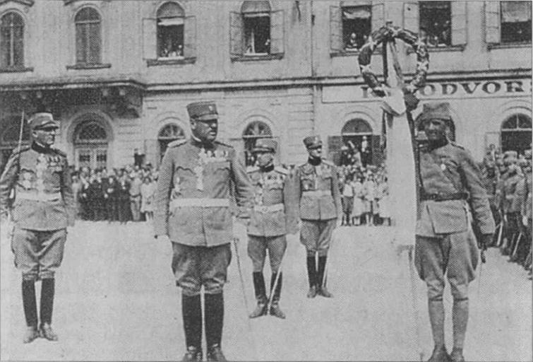 Keywords: Sprejem zastave.jpg sl Sprejem zastave 40 Triglavskega pehotnega polka 9 septembra 1930 pred železniško postajo v Ljubljani 5QOVY9JI doc author 1930-09-09 PD-Slovenia 1930 in Ljubljana 20th-century black and white photographs of Ljubljana Army flags of Kingdom of Yugoslavia Historical images of the main building of Ljubljana Train Station Photographs of military flags of Yugoslavia Wreaths in Ljubljana |