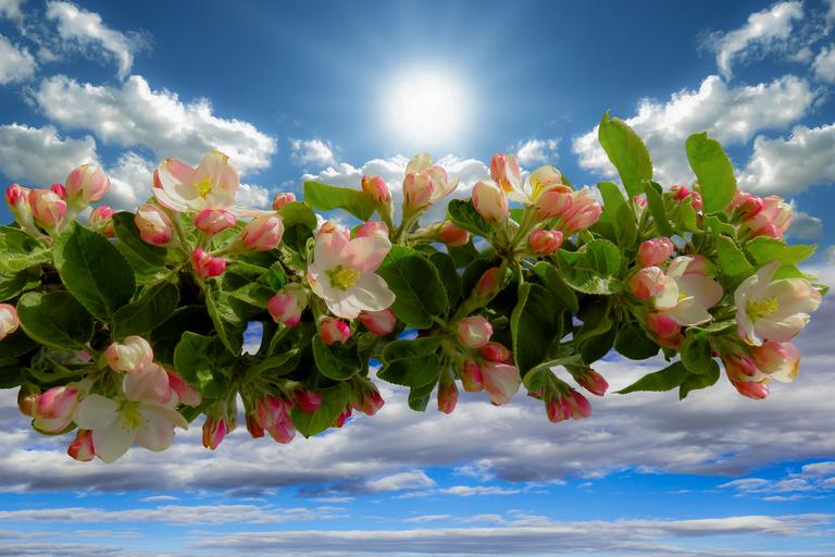 Keywords: spring apple blossom blossom bloom apple tree sun sky apple tree flowers branch close spring awakening fruit leaves blossomed apple blossom branch pink bud bloom