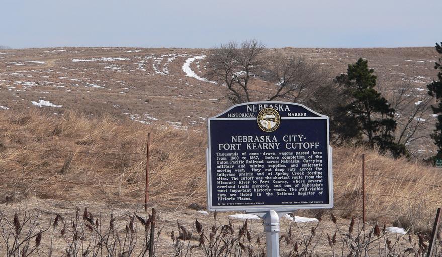 Keywords: Spring Creek Prairie wagon ruts marker.JPG en Historical marker on SW 100th Street in rural Lancaster County Nebraska near the entrance of Spring Creek Prairie Audubon Center The snow-filled wagon ruts referred to by the marker can be seen arcing down the slope in the background left of the bare tree behind the marker 2012-02-21 own Ammodramus cc-zero Uploaded with UploadWizard Pictures by Ammodramus Taken with Panasonic Lumix DMC-FZ20 Spring Creek Prairie wagon ruts Lancaster County Nebraska Historical markers in Nebraska - Migration routes |