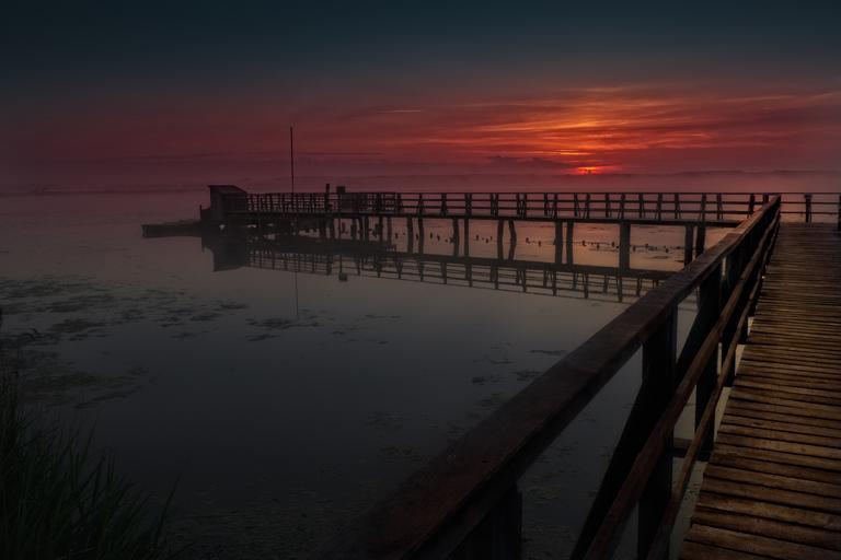 Keywords: spring lake bad buchau web water sunrise waters jetty bridge nature lake bank sky red dawn wood planks landscape rest clouds mood hdr color romantic atmospheric