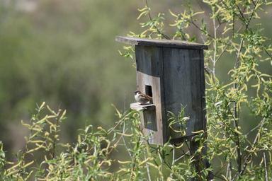 Keywords: spring nature birdhouse sparrow bird against sky