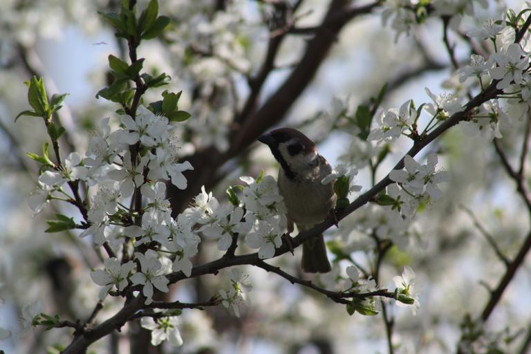 Keywords: spring white bloom nature apple tree leaves natur living nature village trees landscape birdhouse sparrow bird birds