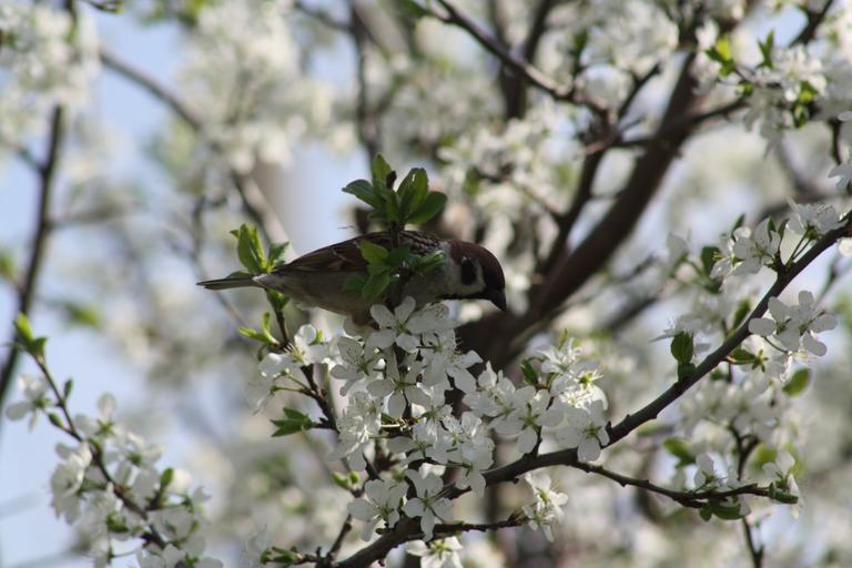 Keywords: spring white bloom nature apple tree leaves natur living nature village trees landscape birdhouse sparrow bird birds