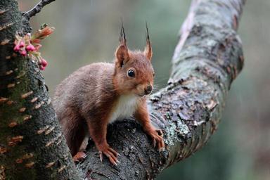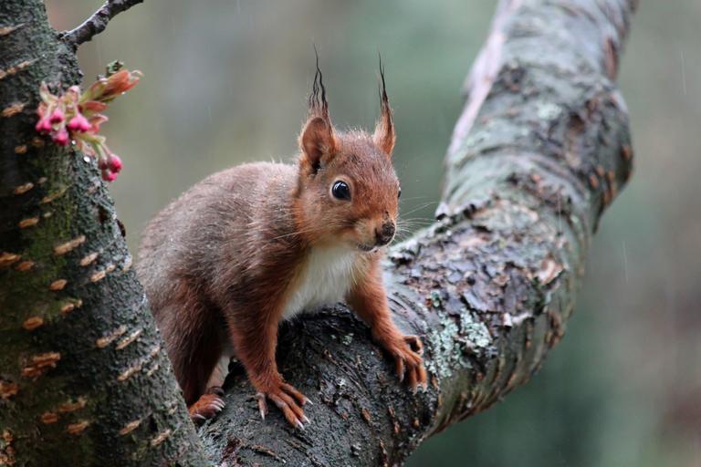 Keywords: squirrel cute croissant nager fur furry animal nature wet rain tree spring japanese flowering cherry japanese cherry trees cherry blossom in the rain mammal claw ears hair view animal portrait animal world close rainy weather