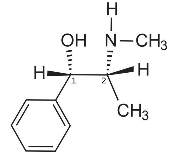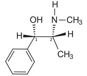 Keywords: SR-Ephedrine.svg en 1S 2R - + -Ephedrine<br> IUPAC Name 1S 2R -2- methylamino -1-phenylpropan-1-ol<br /> The stereocenters are numbered own Wickey-nl 2009-12-15 Inkscape validSVG Ephedrine