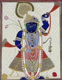 Keywords: Sri nathji.jpg en The blue-skinned god Krishna is shown dressed in a patterned robe and bedecked with jewels and garlands standing before a cloth of white floral material Originally from Nathdwar Temple Rajasthan http //collections vam ac uk/item/O82745/painting-krishna-as-srinathji/ unknown author late 19th century made PD-art 2011-12-08 Shrinathji |