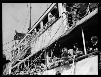 | Keywords: samuel j hood collection samueljhoodcollection hood collection hoodcollection hood morinda burns philp burnsphilp mystery island mysteryisland australian film australianfilm talkie cast crew producer director actors actresses brian abbot brianabbot leslie hay simpson lesliehaysimpson desmond hay desmondhay george rikard bell georgerikardbell grace rikard bell gracerikardbell jean mort jeanmort jean laidley jeanlaidley lost at sea lostatsea motor skiff motorskiff motor launch motorlaunch mystery star mysterystar george doran georgedoran jonas alfred lipman jonasalfredlipman joe lipman joelipman george d malcolm georgedmalcolm farewell streamers vintage vintage clothing vintageclothing walsh bay walshbay 1930s fashion 1930sfashion 1930s women's fashion 1930swomensfashion 1930s women's clothing 1930swomensclothing blackandwhite photo border monochrome diagonal outdoor vehicle boat black and white This photograph depicts the cast and crew members of the Australian film Mystery Island (1937) on board SS MORINDA. The cast and crew were sailing from Walsh Bay, Sydney to Lord Howe Island to shoot the film. Shortly after shooting the film, George Rikard Bell (screen name Brian Abbot) and a fellow cast mate, Leslie Hay Simpson (screen name Desmond Hay), decided to forego the trip back to Sydney on board MORINDA and opted to sail on board the 16-foot motor skiff, MYSTERY STAR. The two were never seen again. Please see our blog for an extended version of the story. This photo is part of the Australian National Maritime Museum’s Samuel J. Hood Studio collection. Sam Hood (1872-1953) was a Sydney photographer with a passion for ships. His 60-year career spanned the romantic age of sail and two world wars. The photos in the collection were taken mainly in Sydney and Newcastle during the first half of the 20th century. The ANMM undertakes research and accepts public comments that enhance the information we hold about images in our collection. This record has been updated accordingly. Photographer: Samuel J. Hood Studio Collection Object no. 00022875 This photograph depicts the cast and crew members of the Australian film Mystery Island (1937) on board SS MORINDA. The cast and crew were sailing from Walsh Bay, Sydney to Lord Howe Island to shoot the film. Shortly after shooting the film, George Rikard Bell (screen name Brian Abbot) and a fellow cast mate, Leslie Hay Simpson (screen name Desmond Hay), decided to forego the trip back to Sydney on board MORINDA and opted to sail on board the 16-foot motor skiff, MYSTERY STAR. The two were never seen again. Please see our blog for an extended version of the story. This photo is part of the Australian National Maritime Museum’s Samuel J. Hood Studio collection. Sam Hood (1872-1953) was a Sydney photographer with a passion for ships. His 60-year career spanned the romantic age of sail and two world wars. The photos in the collection were taken mainly in Sydney and Newcastle during the first half of the 20th century. The ANMM undertakes research and accepts public comments that enhance the information we hold about images in our collection. This record has been updated accordingly. Photographer: Samuel J. Hood Studio Collection Object no. 00022875 |
