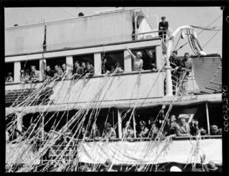 | Keywords: samuel j hood collection samueljhoodcollection hood collection hoodcollection hood morinda burns philp burnsphilp mystery island mysteryisland australian film australianfilm talkie cast crew producer director actors actresses brian abbot brianabbot leslie hay simpson lesliehaysimpson desmond hay desmondhay george rikard bell georgerikardbell grace rikard bell gracerikardbell jean mort jeanmort jean laidley jeanlaidley lost at sea lostatsea motor skiff motorskiff motor launch motorlaunch mystery star mysterystar george doran georgedoran jonas alfred lipman jonasalfredlipman joe lipman joelipman george d malcolm georgedmalcolm farewell streamers vintage vintage clothing vintageclothing 1930s fashion 1930sfashion 1930s women's fashion 1930swomensfashion 1930s women's clothing 1930swomensclothing blackandwhite monochrome photo border outdoor black and white This photograph depicts the cast and crew members of the Australian film Mystery Island (1937) on board SS MORINDA. The cast and crew were sailing from Walsh Bay, Sydney to Lord Howe Island to shoot the film. Shortly after shooting the film, George Rikard Bell (screen name Brian Abbot) and a fellow cast mate, Leslie Hay Simpson (screen name Desmond Hay), decided to forego the trip back to Sydney on board MORINDA and opted to sail on board the 16-foot motor skiff, MYSTERY STAR. The two were never seen again. Please see our blog for an extended version of the story. This photo is part of the Australian National Maritime Museum’s Samuel J. Hood Studio collection. Sam Hood (1872-1953) was a Sydney photographer with a passion for ships. His 60-year career spanned the romantic age of sail and two world wars. The photos in the collection were taken mainly in Sydney and Newcastle during the first half of the 20th century. The ANMM undertakes research and accepts public comments that enhance the information we hold about images in our collection. This record has been updated accordingly. Photographer: Samuel J. Hood Studio Collection Object no. 00022880 This photograph depicts the cast and crew members of the Australian film Mystery Island (1937) on board SS MORINDA. The cast and crew were sailing from Walsh Bay, Sydney to Lord Howe Island to shoot the film. Shortly after shooting the film, George Rikard Bell (screen name Brian Abbot) and a fellow cast mate, Leslie Hay Simpson (screen name Desmond Hay), decided to forego the trip back to Sydney on board MORINDA and opted to sail on board the 16-foot motor skiff, MYSTERY STAR. The two were never seen again. Please see our blog for an extended version of the story. This photo is part of the Australian National Maritime Museum’s Samuel J. Hood Studio collection. Sam Hood (1872-1953) was a Sydney photographer with a passion for ships. His 60-year career spanned the romantic age of sail and two world wars. The photos in the collection were taken mainly in Sydney and Newcastle during the first half of the 20th century. The ANMM undertakes research and accepts public comments that enhance the information we hold about images in our collection. This record has been updated accordingly. Photographer: Samuel J. Hood Studio Collection Object no. 00022880 |