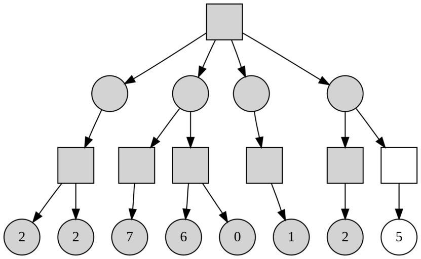Keywords: SSS* example tree.svg en A tree analysed by the SSS algorithm Gray nodes where traversed white ones where ignored This image is based on a PNG file found on the Polish Wikipedia own Jan Stępień 2010-05-25 Created with Graphviz using the following code digraph e shape box height 0 5 width 0 5 style filled fillcolor lightgray label 1 shape circle style filled fillcolor lightgray label 2 shape circle style filled fillcolor lightgray label 3 shape circle style filled fillcolor lightgray label 4 shape circle style filled fillcolor lightgray label 11 shape box height 0 5 width 0 5 style filled fillcolor lightgray label 21 shape box height 0 5 width 0 5 style filled fillcolor lightgray label 22 shape box height 0 5 width 0 5 style filled fillcolor lightgray label 31 shape box height 0 5 width 0 5 style filled fillcolor lightgray label 41 shape box height 0 5 width 0 5 style filled fillcolor lightgray label 42 shape box height 0 5 width 0 5 style filled fillcolor white label 111 shape circle style filled fillcolor lightgray label 2 112 shape circle style filled fillcolor lightgray label 2 211 shape circle style filled fillcolor lightgray label 7 221 shape circle style filled fillcolor lightgray label 6 222 shape circle style filled fillcolor lightgray label 0 311 shape circle style filled fillcolor lightgray label 1 411 shape circle style filled fillcolor lightgray label 2 421 shape circle label 5 e -> 1 -> 11 e -> 2 e -> 3 -> 31 -> 311 e -> 4 11 -> 111 11 -> 112 2 -> 21 -> 211 2 -> 22 22 -> 221 22 -> 222 4 -> 41 -> 411 4 -> 42 -> 421 ValidSVG Game theory Artificial intelligence |