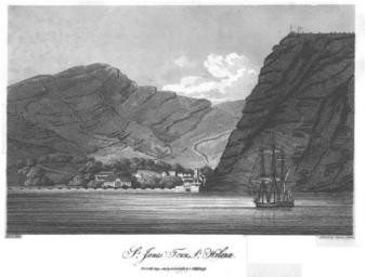 Keywords: St Helena 1812.jpg Jamestown St helena in 1812 Journal of a residence in India etc by Maria Graham later Lady Callcott British Library HMNTS G 2836 1812 author PD-old-100 Views of St Helena Island