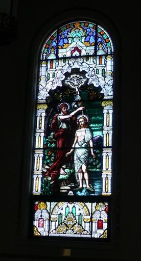 Keywords: St. Leonard church (Madison, Nebraska) baptism window.JPG St Leonard's Catholic Church in w Madison Nebraska The church was designed in Romanesque Revival style by architect Jacob M Nachtigall and built in 1913 With its rectory and a garage it is listed in the National Register of Historic Places The windows were purchased from the Muenich Art Studio in Chicago Illinois This window depicts the Baptism of Jesus Own Ammodramus 2010-02-23 Pictures by Ammodramus Taken with Panasonic Lumix DMC-FZ20 St Leonard's church Madison Nebraska windows Baptism of Jesus Christ on stained glass windows in the United States |