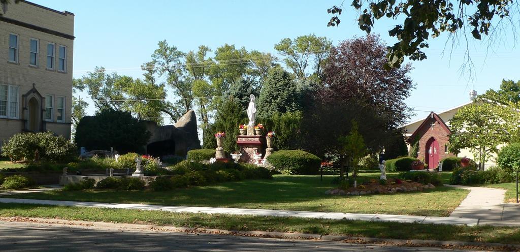 | Keywords: St. Mary Assumption (Dwight, Nebraska) garden and grottoes 1.JPG en Garden and grottoes at St Mary of the Assumption Church complex in Dwight Nebraska; seen from the south The school to the west is at the left edge of the photo; the church to the east is just out of frame to the right The Mother of Grace shrine is in the center; the irregularly-shaped structure behind and to its left is the Gesthemane grotto; a small brick chapel is to the right 2010-09-14 16 11 40 own Ammodramus cc-zero Uploaded with UploadWizard Pictures by Ammodramus Taken with Panasonic Lumix DMC-FZ20 St Mary of the Assumption complex Dwight Nebraska |