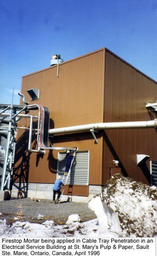 Keywords: St marys kfg ext installation.jpg Firestop Mortar being applied in Cable tray Penetration in an Electrical Service Building at St Mary's Pulp Paper a Paper mill in Sault Ste Marie Ontario Canada April 1996 Own 2007-09-02 Achim Hering Firestops being installed St Mary's Paper Distribution substations in Canada Cable trays Firestop mortar 3M Fire Barrier Mortar |