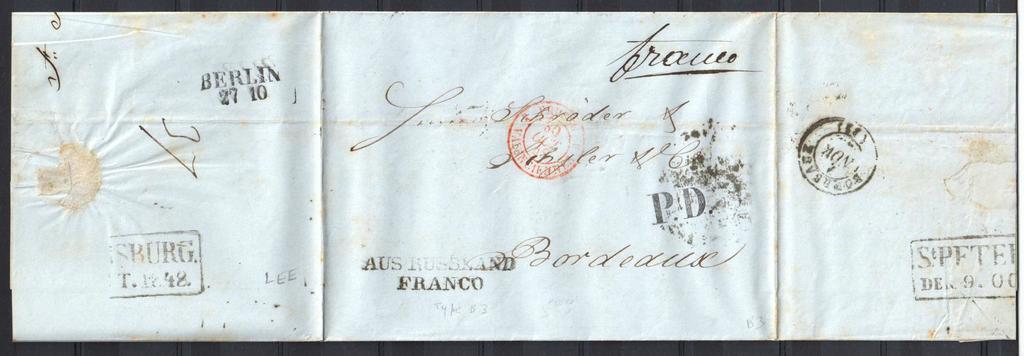 Keywords: St Petersburg 1848 Dob0102306b.jpg en Russia stampless folded letter to France 'St PETERSBURG DEN 9 OCT 1848 ' boxed cancel manuscript 'franco' Black 'P D ' straight line 'AUS RUSSLAND FRANCO' French 'PRUSSE VALENCIENNES 30 OCT 48' c d s Bordeaux 1 NOV 48 arrival Details October 9 1848 Julian paid letter posted at St Petersburg Sender wrote 'franco' Not restated at post office The postmark 'St PETERSBURG DEN 9 OCT 1848' was applied Dobin 1 02 type 3 06 Reception expedition of foreign correspondence used 1844-1853 Rarity 4 <ref> cite book Manfred Dobin Postmarks of Russian Empire Pre adhesive period St Petersburg Standard Kollektion 1993 9785853870222 </ref> October 27 Gregorian 'BERLIN 27 10' typical Berlin transit postmark and 'AUS RUSSLAND FRANCO' applied Based on the usual presence of these Berlin postmarks this 'AUS RUSSLAND FRANCO' marking is regarded as a Berlin mark White Aus Russland type B3 October 30 red 'PRUSSE VALENCIENNES 30 OCT 48 3' French entry mark at Valenciennes 3's show the postmark was struck at Paris Letter was also marked by the French with 'P D ' Payee au Destination Noël 1021<ref> cite book Gilbert Noël Catalogue des oblitérations des chiffres-taxe carrés de France 1859-1878 1956 Paris E H de Beaufond </ref> No readable transit postmark but likely transit in Paris on October 30 November 1 'BORDEAUX 1 NOV 32 ' arrival backstamp 1848 Scan of original Postal authorities Sources reflist PD-old-100 Stampless covers of Russia Marque d'entrée en France Gare de Valenciennes Postmarks of Saint Petersburg Entry and transit postmarks of Germany 1848 postmarks |