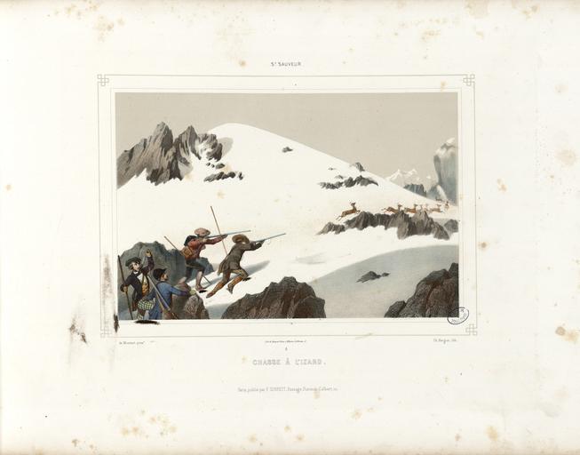 | Keywords: St. Sauveur - Chasse à l'izard (i.e. isard) - Fonds Ancely - B315556101 A MONTAUT 010.jpg Fait partie de deux albums réunis et publiés par F Sinnett à Paris Lith de Becquet frères à Paris Les planches du premier album ont été dessinées par Montaut et lithographiées par Bargue Les planches du second album ont été dessinées et lithographiées par Charles Maurice Le titre du premier album est lithographié Le premier album est signalé dans la bibliographie pyrénéiste de Jacques Labarère comme étant très rare Pièce jointe photocopie en n et b d'une lithographie de Montaut intitulée Col de Tortes - Traversée de la montagne Ancely René 1876 - 1966 Possesseur fre public domain domaine public B315556101_A_MONTAUT_010 jpg image/jpeg 1 f de pl lithogr ; 30 cm oblong Sinnet F Éditeur Bargue Charles 1826 -1883 Lithographe Becquet 18 - 18 ; imprimeur Lithographe http //numerique bibliotheque toulouse fr/collect/general/index/assoc//ark /74899/B315556101_A_MONTAUT_010 dir/B315556101_A_MONTAUT_010 jpg A-MONTAUT 8 http //catalogues toulouse fr/web2/tramp2 exe/do_keyword_search/log_in setting_key BMT1 servers 1home query p001735 vignette http //numerique bibliotheque toulouse fr/collect/general/index/assoc//ark /74899/B315556101_A_MONTAUT_010 dir/B315556101_A_MONTAUT_010_thumb jpeg by 1852 St Sauveur - Chasse à l'izard i e isard B315556101_A_MONTAUT_010 woodblock print - lithography - engraving - colors - color lithograph Rupicapra pyrenaica Bags Hunters Batons Male clothing Rocks Redingotes in art Trousers French national costumes Mountains of France in art Rifles in art Shoes Hats Men Gaiters Caps Luz-Saint-Sauveur Jackets Hunting in France |