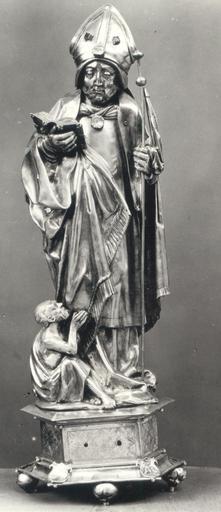 Keywords: St Stanislaus Reliquary.JPG Reliquary - statue of St Stanislaus silver sheet gilding Relikwiarz - figura św Stanisława blacha srebrna złocenie 72 cm 28 35 in Catalogue of stolen and missing cultural achievements / comp Jan Świeczyński; Ośrodek Informacyjno-Koordynacyjny Ochrony Obiektów Muzealnych Warsaw 1988 Editor Wojciech Jaskulski Piotr Ogrodzki See also http //www mkidn gov pl/kolekcje/ Department of National Heritage Wartime losses an official webpage of Polish Ministry of Culture Art and National Heritage ca 1500 ; photo made before 1939 Stanisław Stwosz Stanislaus Stoss ca 1478-1528 ; author of photo unknown PD-Polish Anonymous-EU Goldsmithery lost in Poland during World War II Gothic reliquaries Statues of Saint Stanislaus in Poland Medieval metalwork |