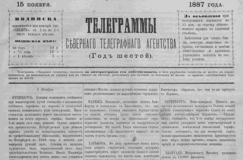 | Keywords: Sta.jpg ru газета Телег аммы Севе ного телег афного агентства Издавалась в И кутске И кутская го одская библиотека Редакция газеты Телег аммы Севе ного телег афного агентства 1887-11-15 PD-Old Newspapers of Russia 1887 15 November Media of Irkutsk History of Irkutsk Newspapers of Russia to be categorised by name |