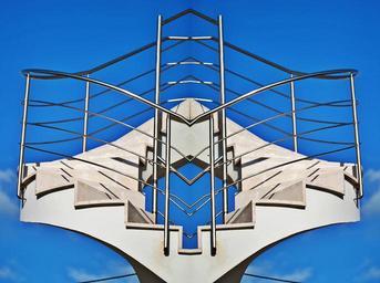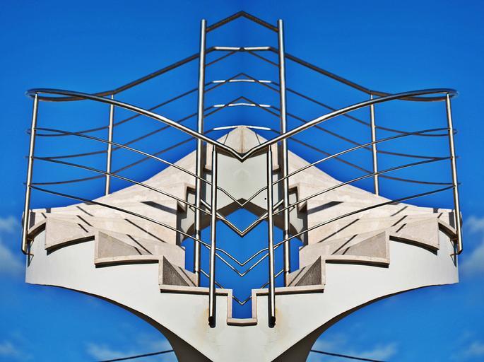 Keywords: stairs metal art gradually spiral staircase rise steel grid railing iron structure slope shiny reflection blank mirroring object object art sculpture sky sky blue sunlight illuminated metal railings symmetry evenly stainless steel