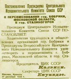 Keywords: Stalinogorsk rename.jpg ru Постановление П езидиума Цент ального Исполнительного Комитета Союза ССР о пе еименовании го Боб ики осковской области в го Сталиного ск http //www nmosk ru/index php option com_content task view id 4512 Central Executive Committee of the Soviet Union 1933-12-27 PD-RU-exempt History of Novomoskovsk Source http //www nmosk ru/index php option com_content task view id 4512 |