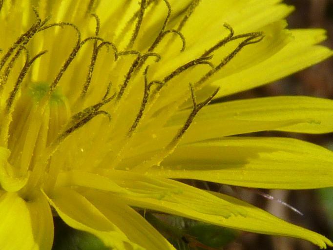 Keywords: Stamens of Picris echioides 2of2.JPG en Part of a flowerhead of Picris echioides Asteraceae Cichorieae showing many individual ray-florets each with a style ending in two divergent long stigmas The five anthers in each floret are connected to eachother forming a narrow tube While the style grows through this tube it hoovers up pollen grains on its hairs From there visiting insects are dusted with pollen which they wipe off on the stigmas of the next flower head they visit As the florets mature the stigmas curl back untill eventually coming into contact with the style thus ensuring self-pollination if cross-pollination did not succeed own Hildesvini Cc-zero Picris echioides |
