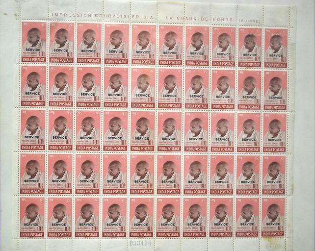 | Keywords: Stamp India 1948 Gandhi 10Rs Service overprint.jpg The normal un-overprinted stamp was issued in 1948 after the assassination of Mahatma Gandhi One sheet of 100 stamps were overprinted with the Service overprint of which this is a pane of 50 stamps <br>See India 10 Rupees Mahatma Gandhi postage stamp for details This picture was taken by myself Kaleshkumar at the International Philatelic Exhibition Indipex 2011 held at New Delhi where it was exhibited Stamp issued in 1948 photo by en wiki user Kaleshkumar Stamps issued by the Indian Department of Posts and this sheet is owned by them Stamp licence PD-India Image licence cc-zero Original upload log page en wikipedia GandhiService10Rs jpg Upload date User Bytes Dimensions Comment 2011-02-20 15 09 55 Kaleshkumar 6720887 3251×2592 <small><nowiki>This picture was taken from the International Philatelic Exhibition Indipex 2011 held at New Delhi The sheet in this image belongs to Department of Posts India </nowiki></small> Gandhi on 1948 stamps of India Overprints on stamps of India Philatelic uploads by Ww2censor India Official stamps |
