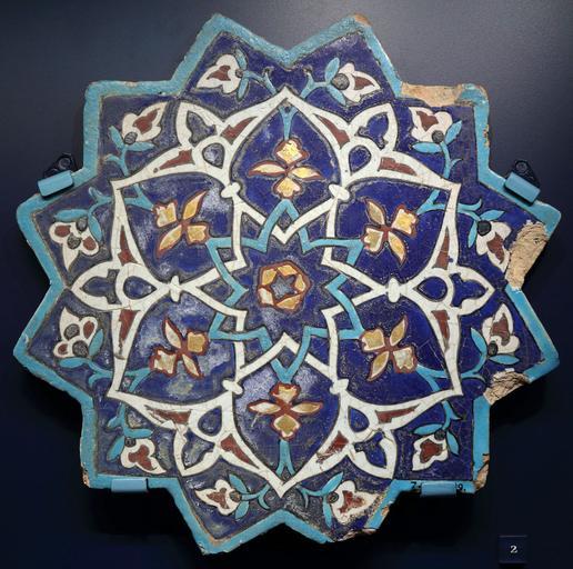 Keywords: Star-shaped tile V&A C.747-1909.jpg Star-shaped tile with 12 points place of creation Khargird Iran circa 1444 Earthenware body under coloured glazes applied using the cuerda seca technique Diameter 40 cm Institution Victoria and Albert Museum Islamic Middle East room 42 case WE4 object history credit line Thought to have come from the west iwan of the Ghiyathiyyah madrasah built 1444 at Khargird in Khurasan Iran by the vizier of the Timurid ruler Shahrukh accession number http //collections vam ac uk/item/O108133/tile-unknown/ C 747-1909 own photo date 2015 Aa77zz artwork license PD-old-100 photo license other versions Cuerda seca ceramics Islamic art in Victoria and Albert Museum Star tiles from Iran |