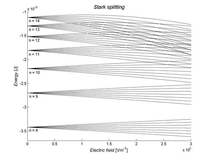 Keywords: Stark splitting in hydrogen.png This graph shows the energy eigenvalues of Stark shifts in hydrogen as a function of electric field strength Magnetic quantum number m 1 parabolic quantum number n1 ˆ’ n2 -n+2 -n+4 n-4 n-2; states with higher principle quantum number n experience a greater energy shift for a given electric field strength For large field strengths energy eigenvalues do not actually cross; rather the solutions are given by the Mathieu functions DJIndica Source Created using MATLAB 6 5 Date 16/3/2006 Author Jeffrey Philippson Hydrogen physics |