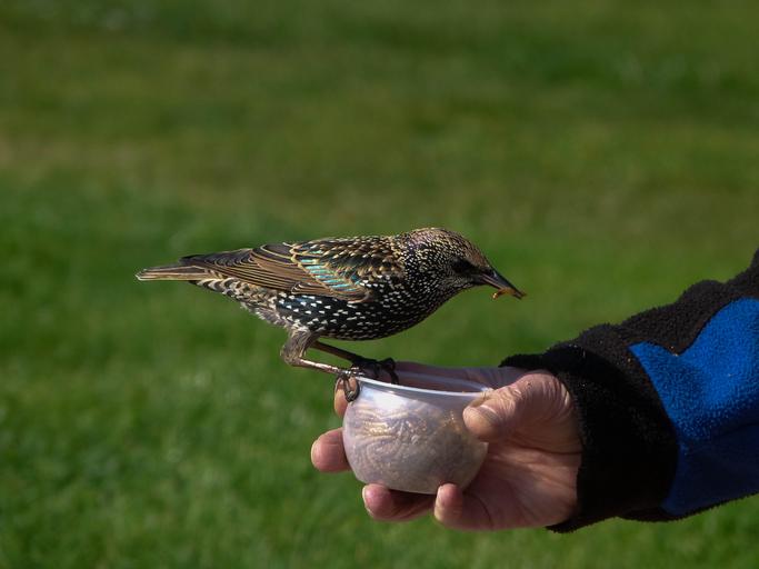 Keywords: starling bird striking eating hungry tame nature wildlife feather spring sunny